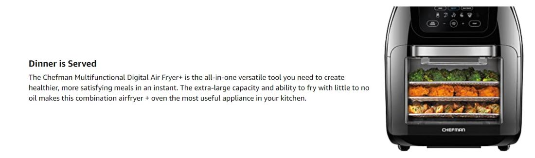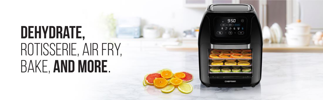The Chefman Multifunctional Air Fryer+ with Rotisserie and Dehydrator Function handles any cooking�� baking�� or air frying task. With the efficient rapid air technology and high-speed convection oven system�� you can quickly get an even�� crispy fried texture using little-to-no oil. Perfect for feeding a crowd�� this multifunctional air fryer features a 10-liter capacity and 17 preset options – use it to air fry�� roast�� dehydrate�� bake�� reheat�� and more! Purchase includes a 1-year assurance from Chefman. For information on how to use your product�� see the PDF User Guide. 120 Volts/1700 Watts -RJ38-10-RDO-V2.
