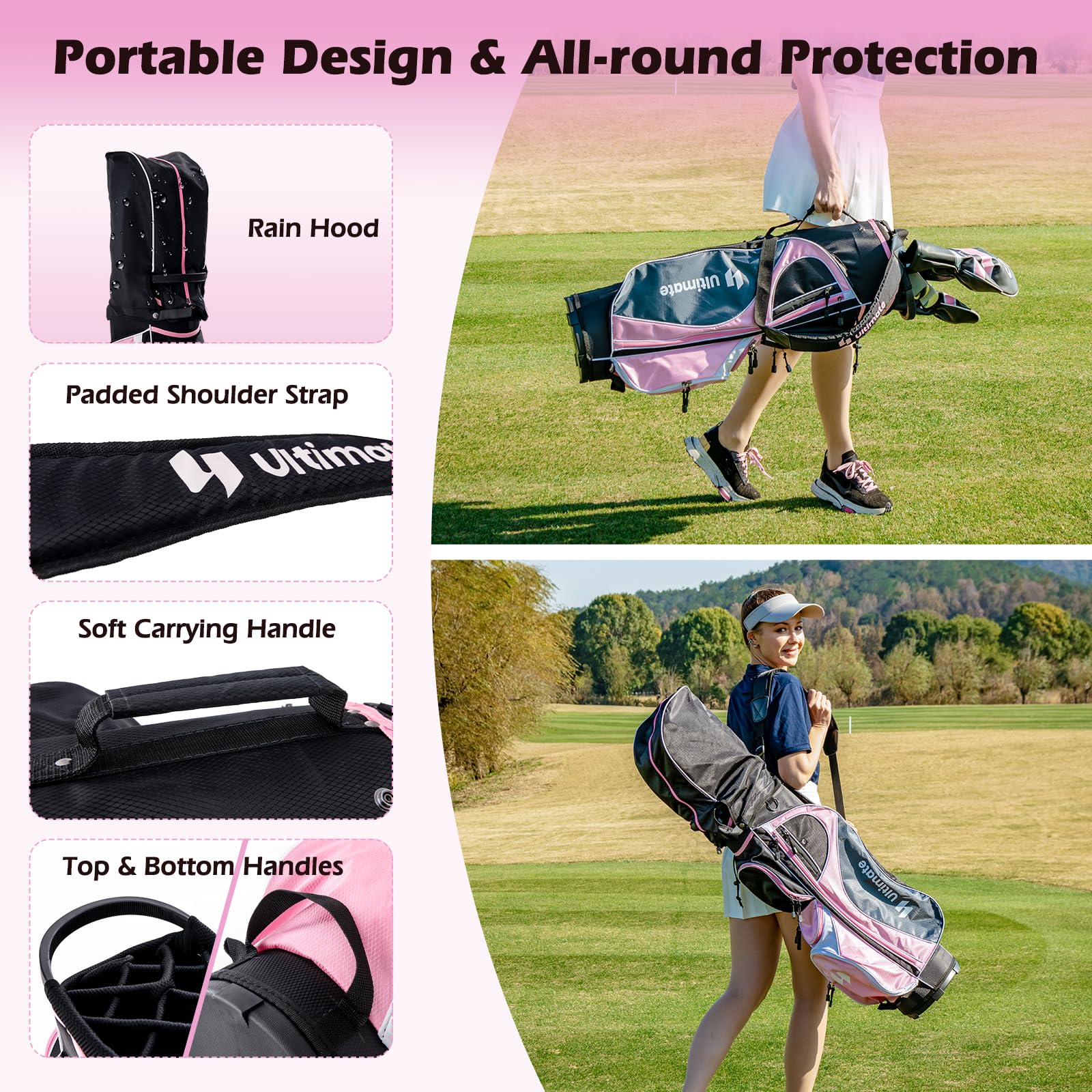 - 🏌🏼♀️【Portable Design & All-round Protection】 Featuring a padded shoulder strap, soft carrying handle, top and bottom handles, the lightweight golf bag is easy to carry. Besides, a rain hood and 3 head covers are included to protect your golf clubs from damage during transportation.