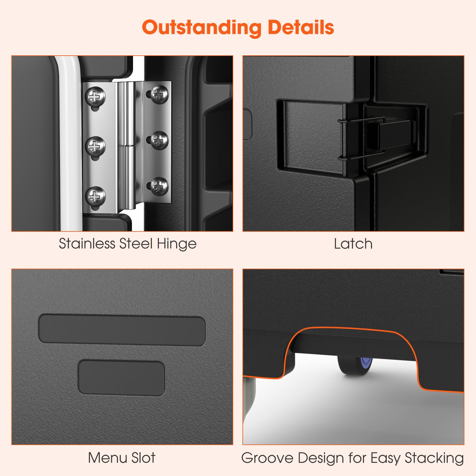 • Transport & Store With Ease: The insulated food warmer features 2 universal wheels and 2 directional wheels with brakes for effortless movement and smooth stops. Additionally, the carrier is equipped with 2 handles for easy transportation. With grooved bottom, the food pan carrier is stackable to save space.