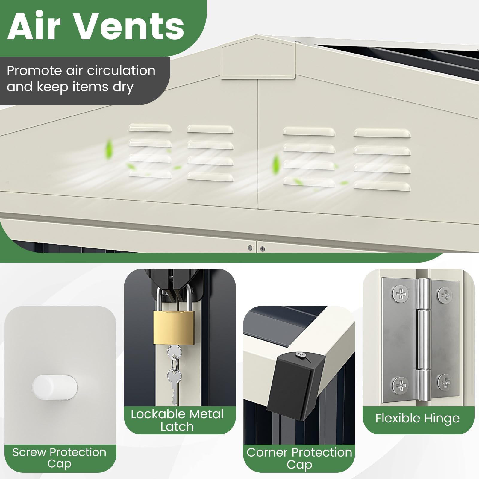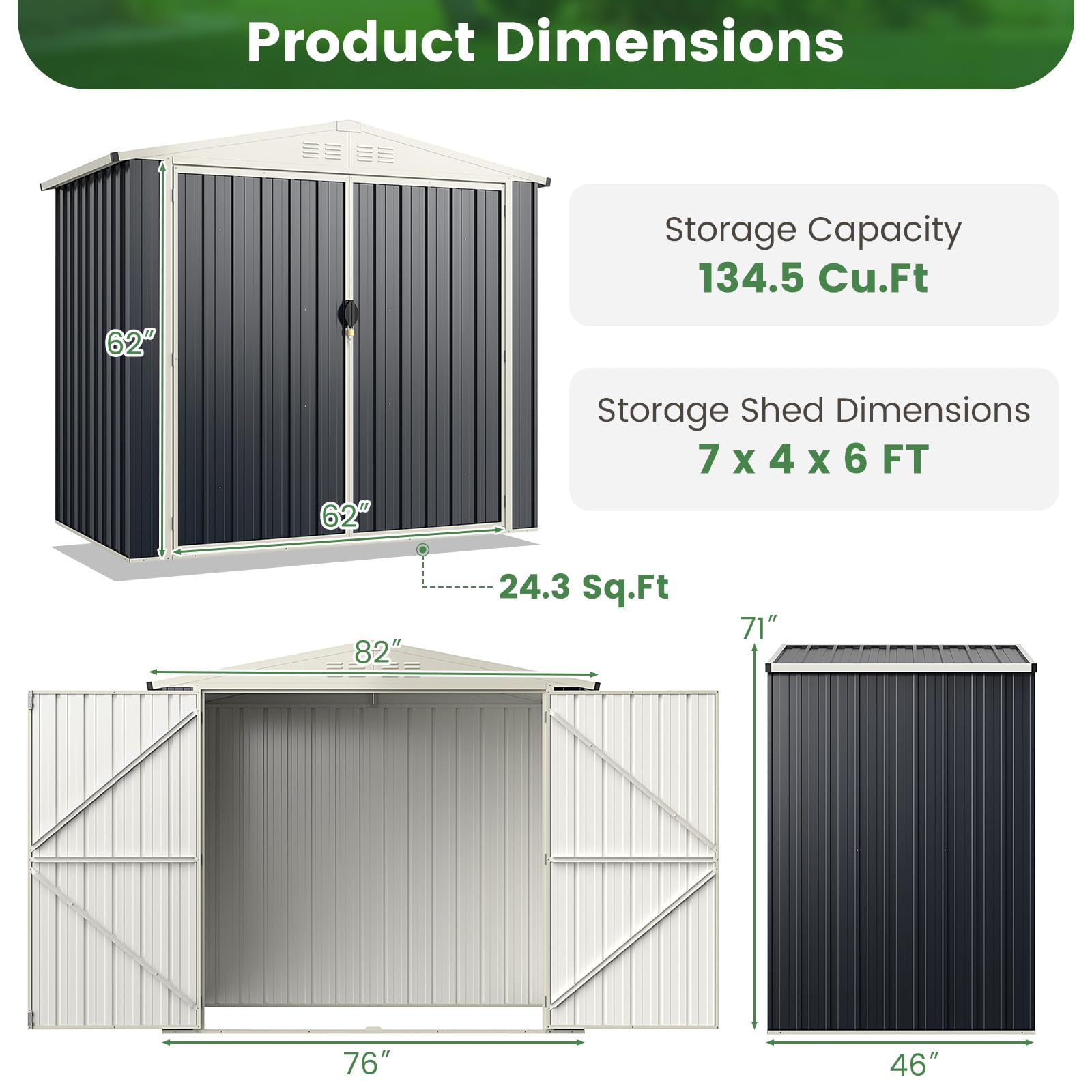 - Spacious Space & Versatile Use: This metal garden shed measures 7 x 4 x 6 FT (L x W x H)/8 x 6.3 x 6 FT (L x W x H) and the storage capacity is 134.5 Cu.Ft/264.5 Cu.Ft, providing ample space for gardening tools and equipment, and it can keep your yard clean and tidy. Moreover, this multifunctional outdoor storage shed can also be served as a tool room, utility room, garbage room, or even as a pet house.