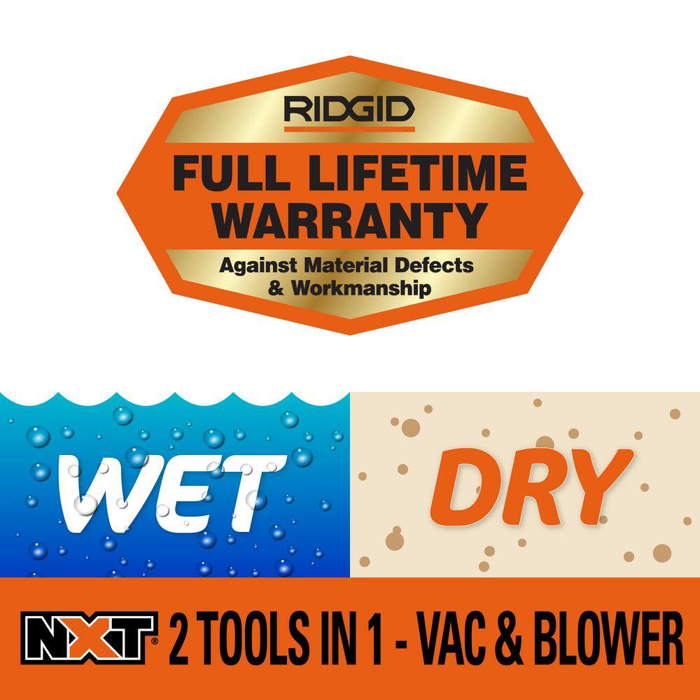 Includes ridgid 16 gal. 6.5 peak horsepower wet/dry shop vacuum with detachable blower – 2 tools in 1; maximum power and large capacity for heavy-duty cleanup and a powerful detachable emission free blower that attaches to blower wand for clearing debris in outdoor spaces